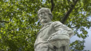 The complex depicts Verdi standing in a solemn pose, placed on a high pedestal adorned with four sculptural groups dedicated to the protagonists of his most famous works: Falstaff, Leonora (from La Forza del Destino), Aida and Othello. These figures, sculpted with great realism, represent the variety of Verdi’s universe, where themes such as passion, heroism and humanity coexist.