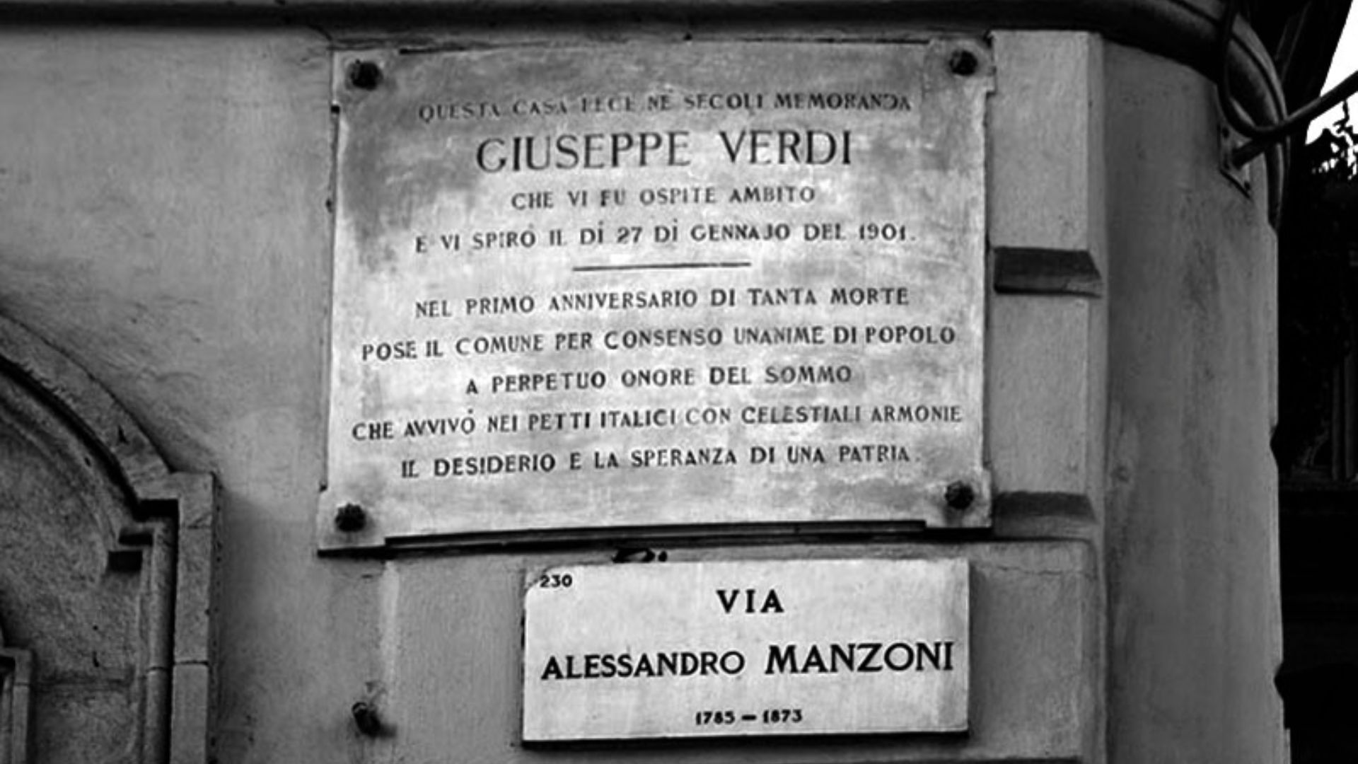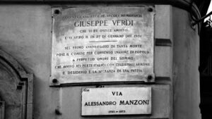This house was made forever memorable by Giuseppe Verdi, who was an honored guest here and drew his last breath on January 27th, 1901. […] In lasting honor of the great man who, through celestial harmonies, stirred in Italian hearts the desire and hope for a nation.